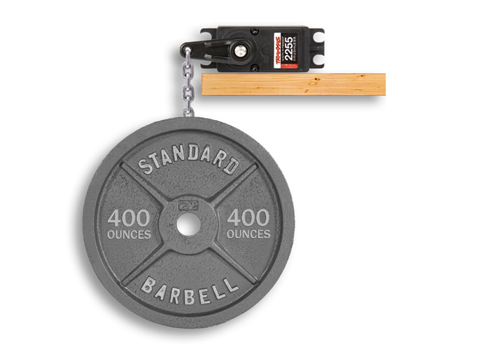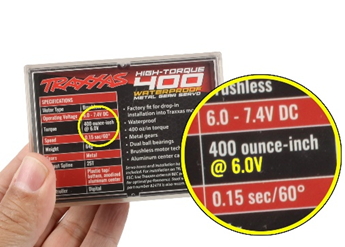 When comparing servo specs, be sure to note the voltage that the manufacturer says is required to achieve the stated performance numbers. For example, the Traxxas High-Torque 400 servo’s torque is stated as “400 ounce-inch @ 6.0 V.” That means the servo supplies 400 ounce-inches of torque when powered at six volts.Suppose you’re comparing the Traxxas 400 oz.-in. servo to another brand’s servo that claims “400 oz.-in. @ 7.4 V.” That servo appears to be equally powerful since it’s also rated at 400 ounce-inches, but since it needs 7.4 volts to achieve that torque, it will offer less torque when powered at six volts. In this example, that servo’s torque would drop to about 324 oz.-in. on six volts, making it considerably less powerful than the Traxxas servo at the same voltage. Always check voltage when comparing specs.