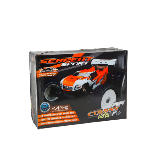 This is the Serpent S811T-E “Cobra E” RTR 1/8 Scale 4WD Electric Truggy, equipped with DragonRC brushless electronics and a 2.4GHz radio system. The Serpent Cobra E-Truggy in RTR trim is a great all-around truck. As a basher, this is the ideal platform for fun featuring big power, a 4WD drivetrain, and engineering designed to take a beating. As a racer, this RTR truggy is a great platform to get your feet wet in competition, with plenty of aftermarket support and accessories to choose from. Plus, this truck is based off the purebred racer, the Serpent Cobra E-Truggy.